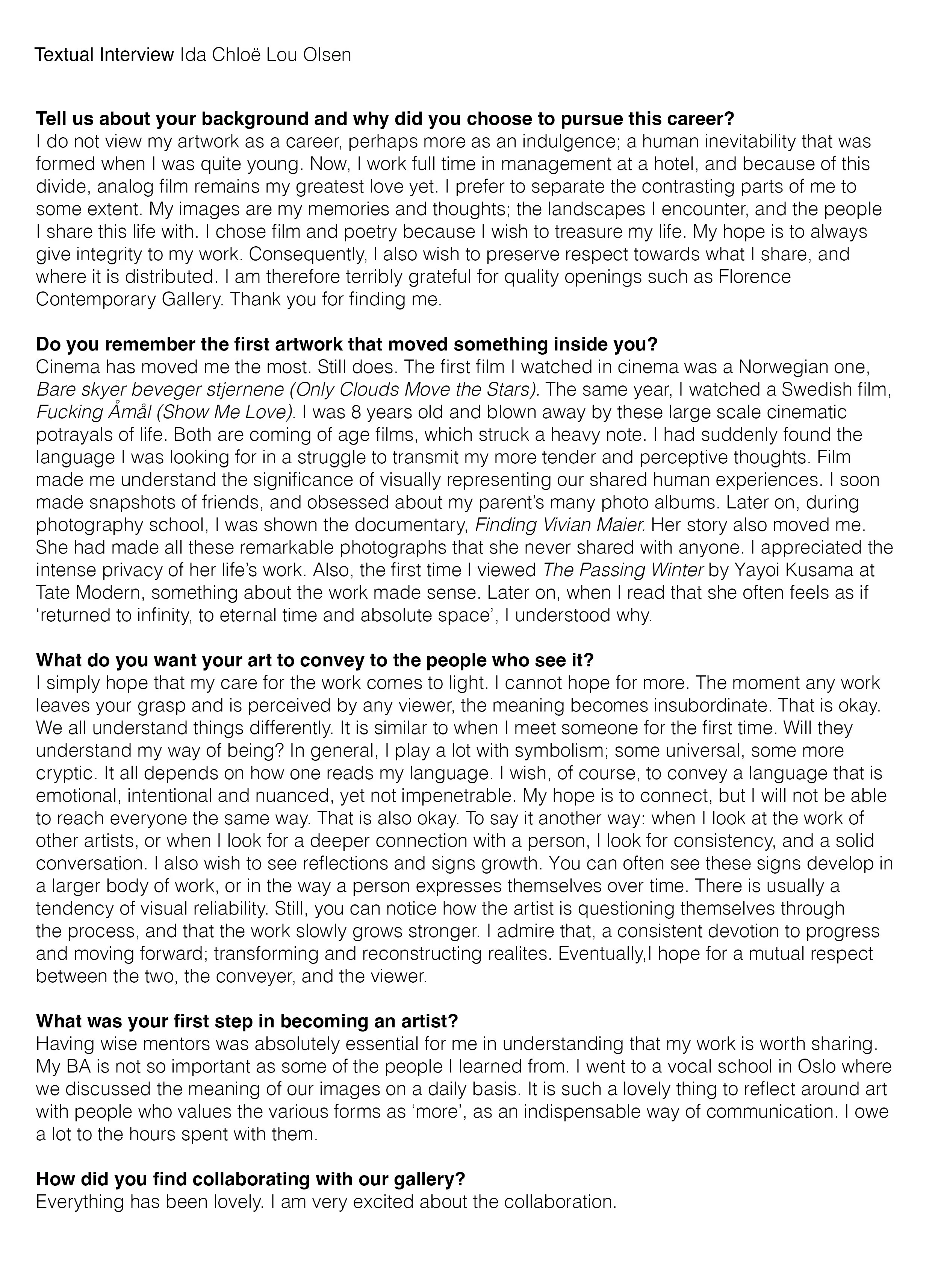 My first solo exhibition, CLOUDLAND, is currently showcased at galleri kyo in Copenhagen. The photographs displayed are for sale (only one print of each). There is also 10 other images available for print and sale on request, which was showcased on an image projector screen. Please e-mail me for a full list of titled photographs. If you wish, you can also agree upon a private viewing at the gallery. Maria Preisler can be contacted further for sizes, prices, and practical information. Details about opening times are available at www.gallerikyo.dk / @gallerikyo.